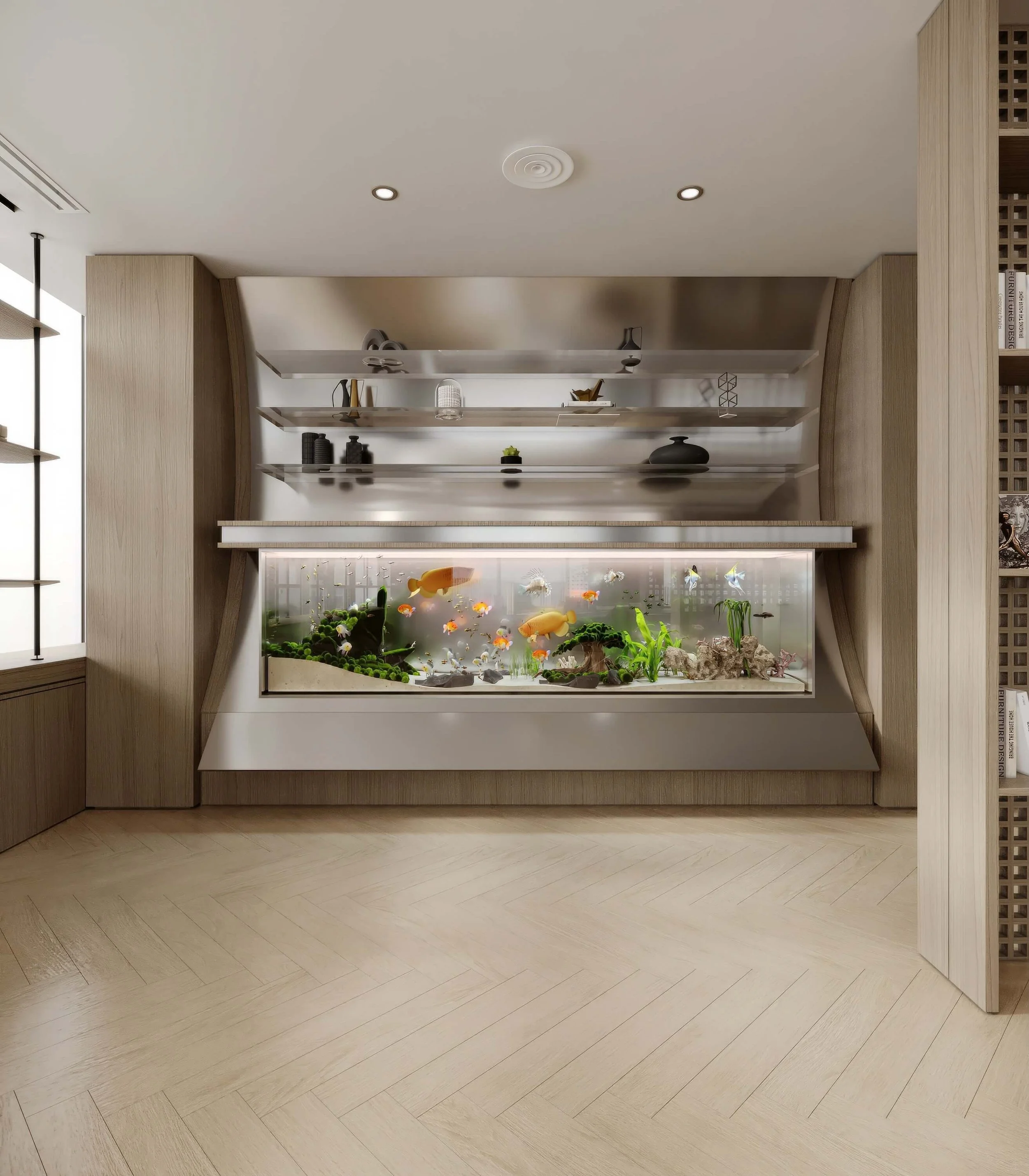 This executive office required a thoughtful refresh that respected the authority of the original space while aligning it with the company’s continued growth. Several prominent elements, including the main screen, aquarium feature, and desk, were to remain, presenting the challenge of introducing a new design language within established parameters.