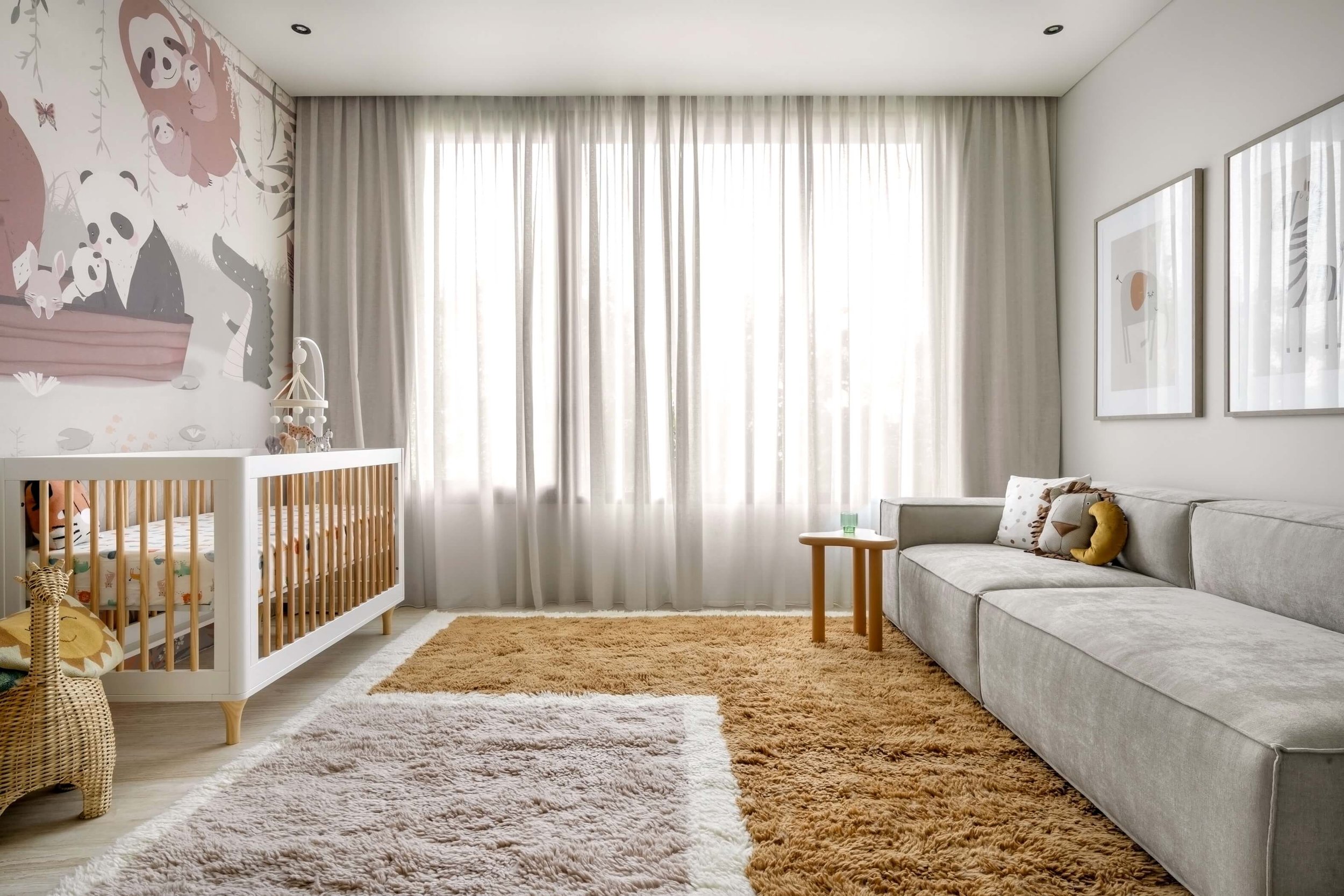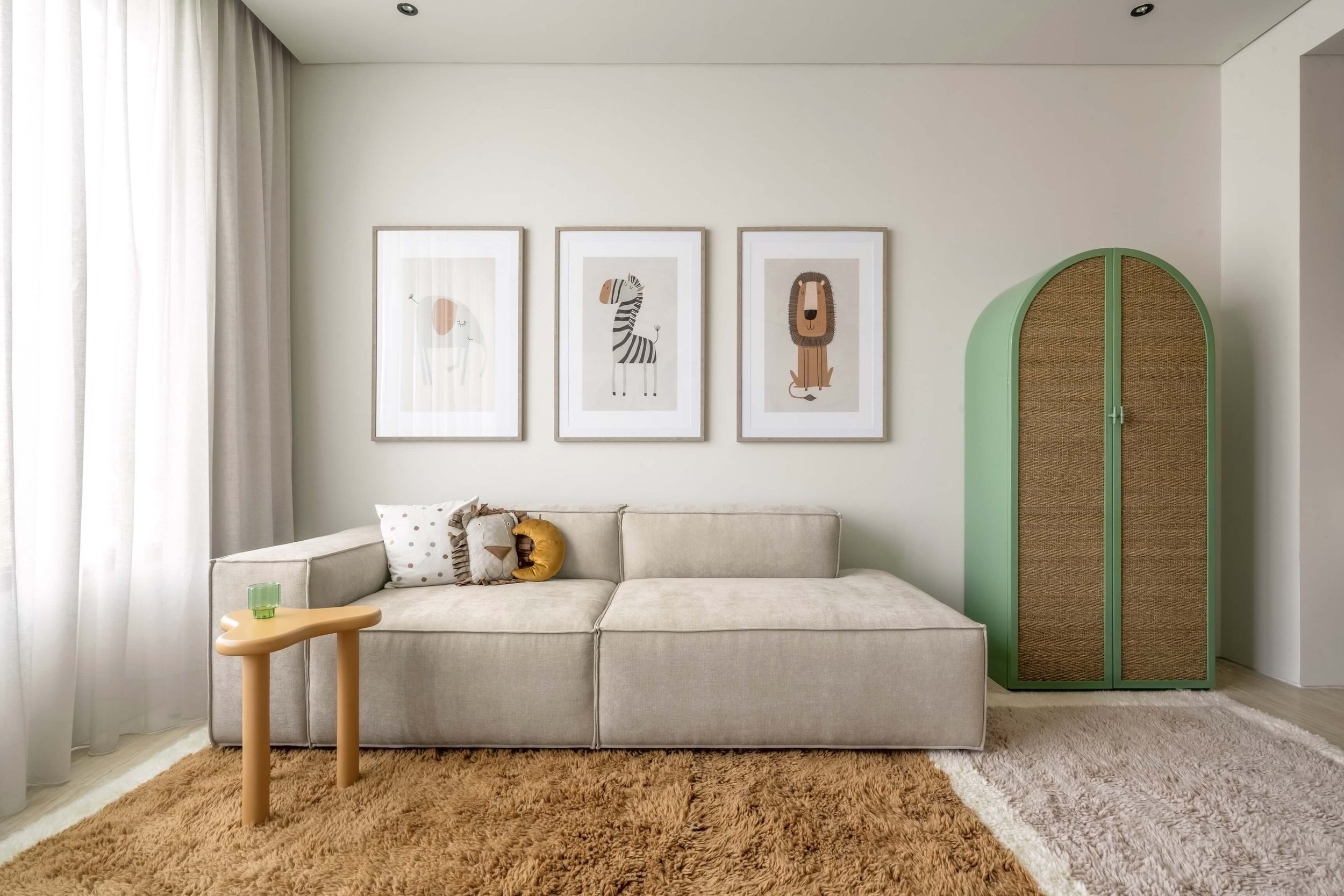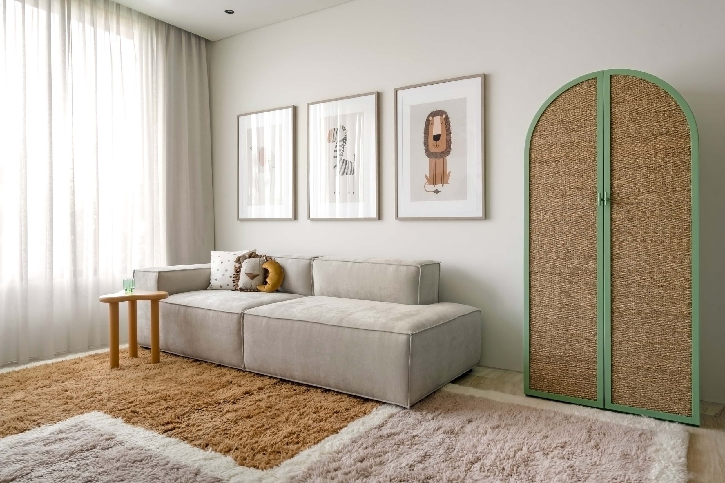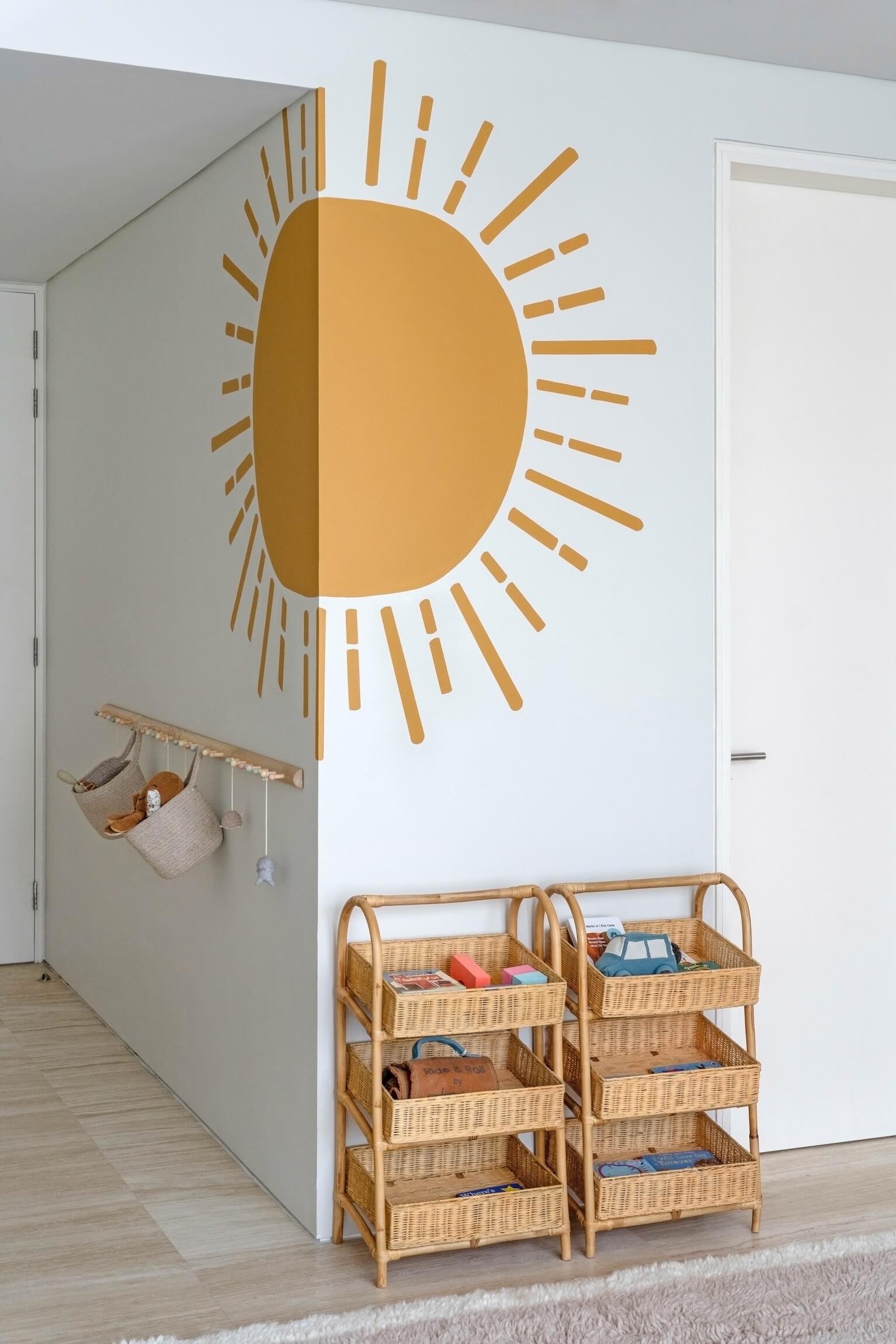 Custom-made cabinetry and tailored furniture were introduced to ensure both functionality and longevity, allowing the room to evolve over time. A hand-painted sun mural adds warmth and perspective, becoming a focal point that brings personality without excess.
