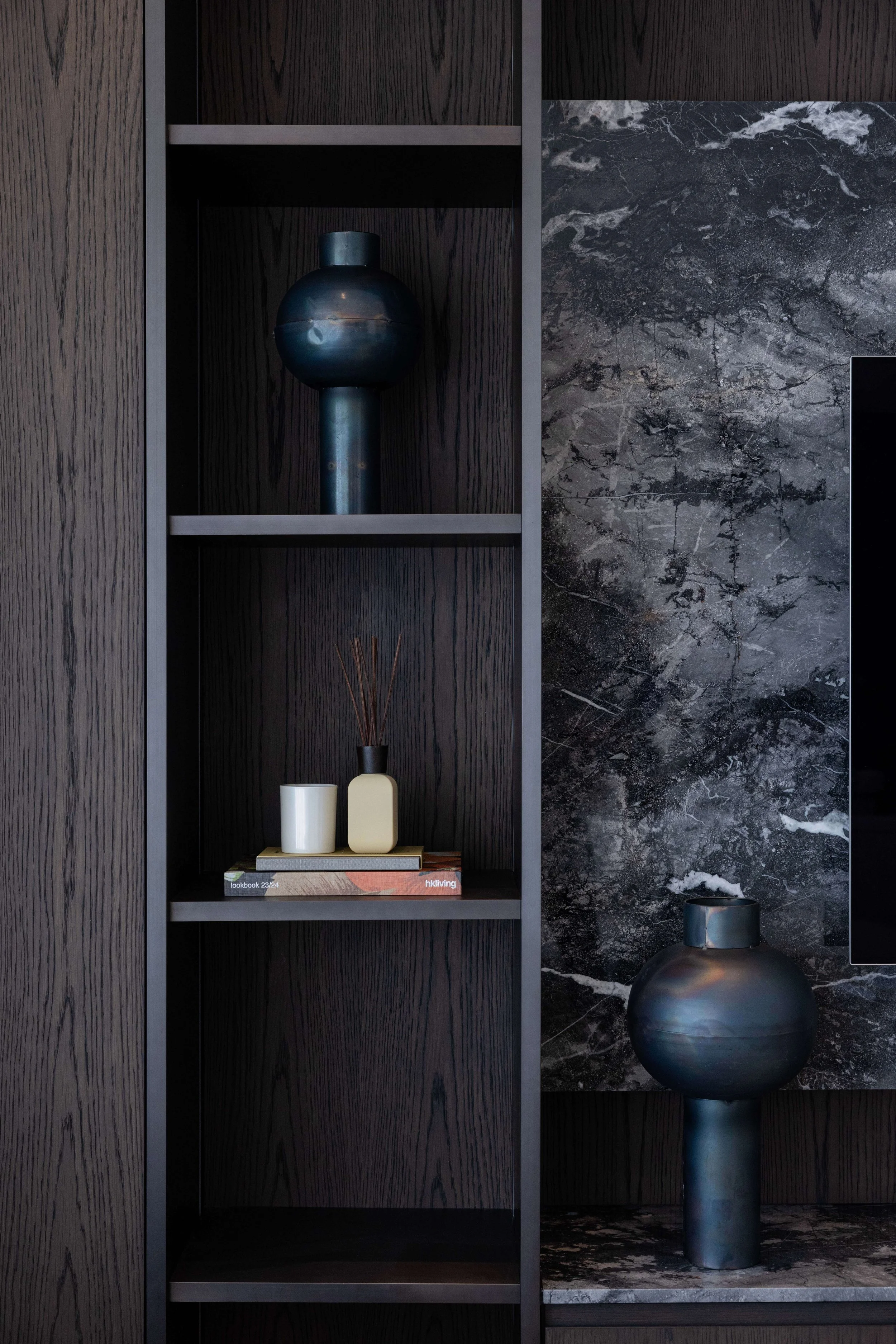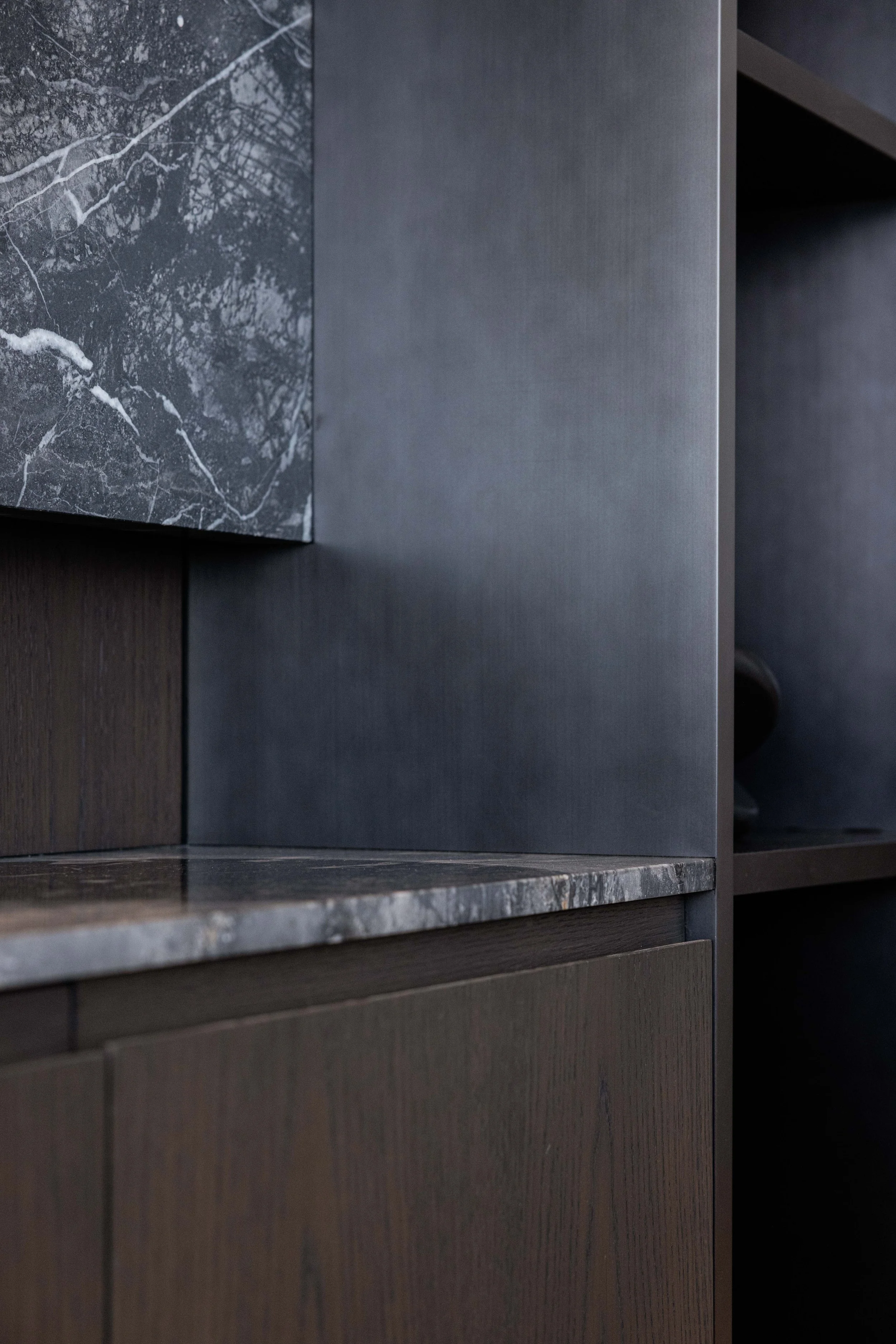 Materiality plays a central role throughout. Dark veneered cabinetry and a Nero Arabesco marble backsplash bring depth and contrast, while integrated appliances maintain a sense of calm and visual continuity. The client’s art collection was carefully framed into the design, becoming a focal point rather than an afterthought, elevated by custom detailing and soft accents.