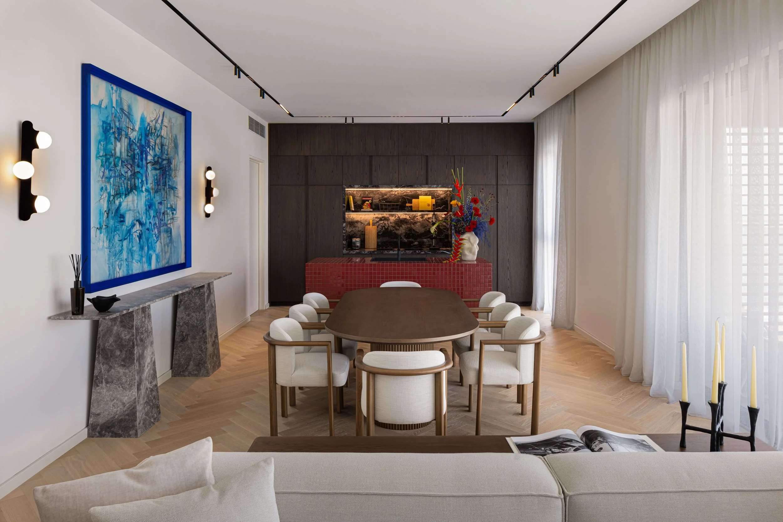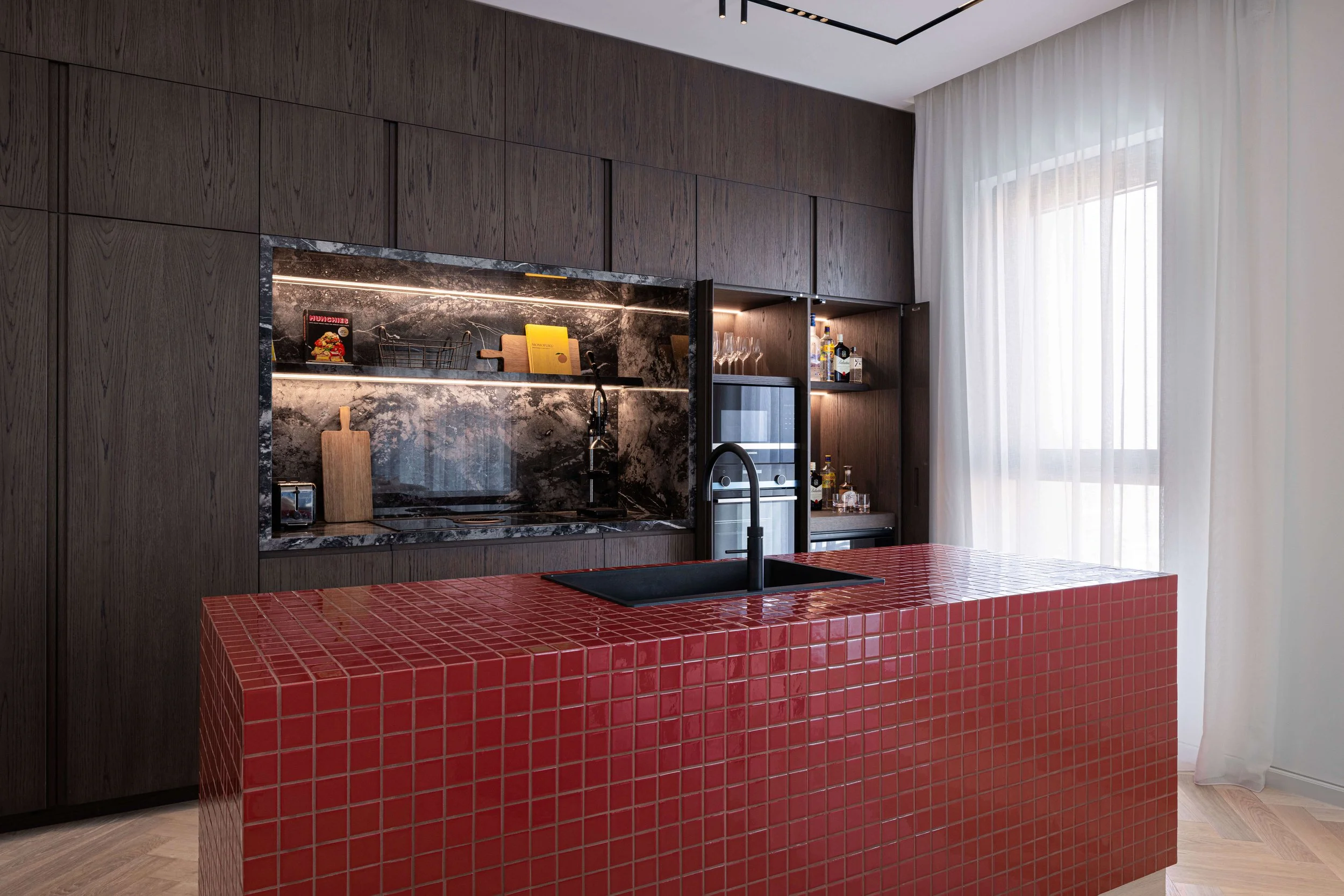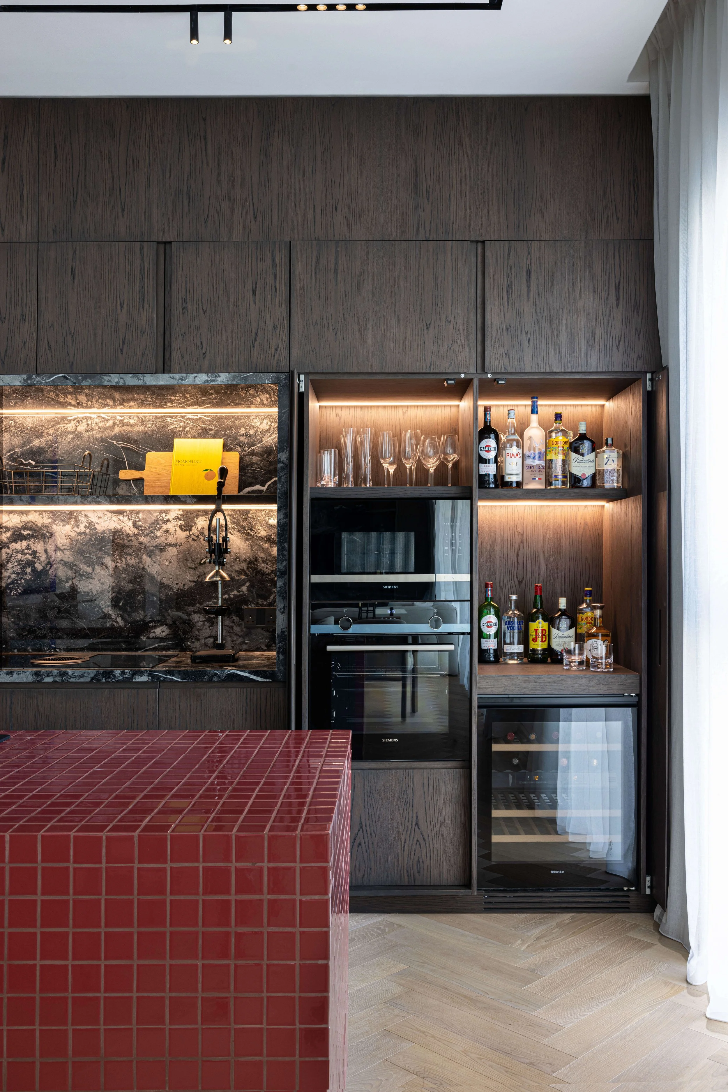 The living and kitchen area was conceived as a statement space, almost gallery-like in its composition. Warmth was introduced through herringbone wood flooring, while a clean ceiling plane with a refined rectangular lighting track created structure and rhythm. At the heart of the space sits a glossy burgundy-tiled kitchen island, designed to appear as though it floats, anchoring the room with quiet confidence.
