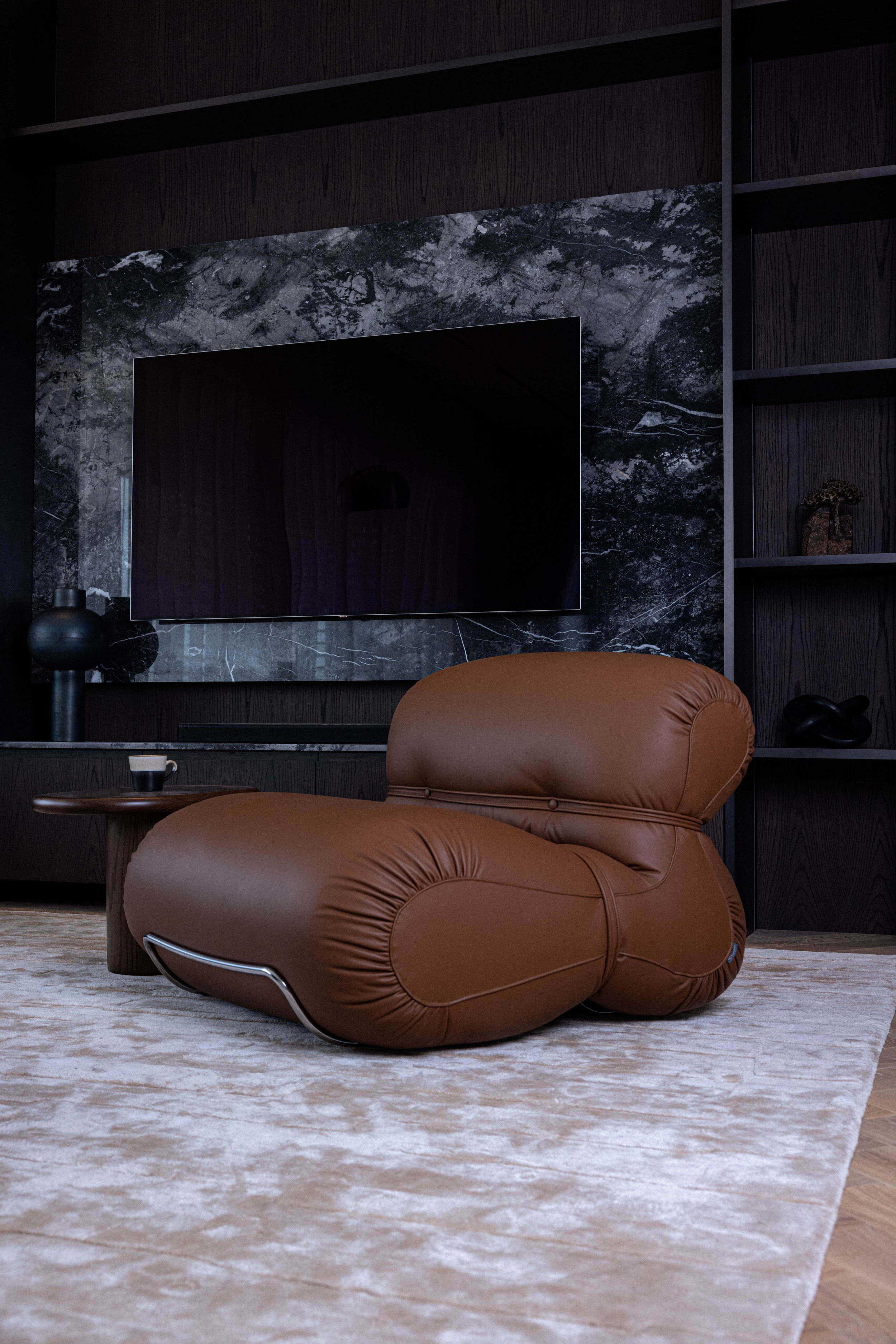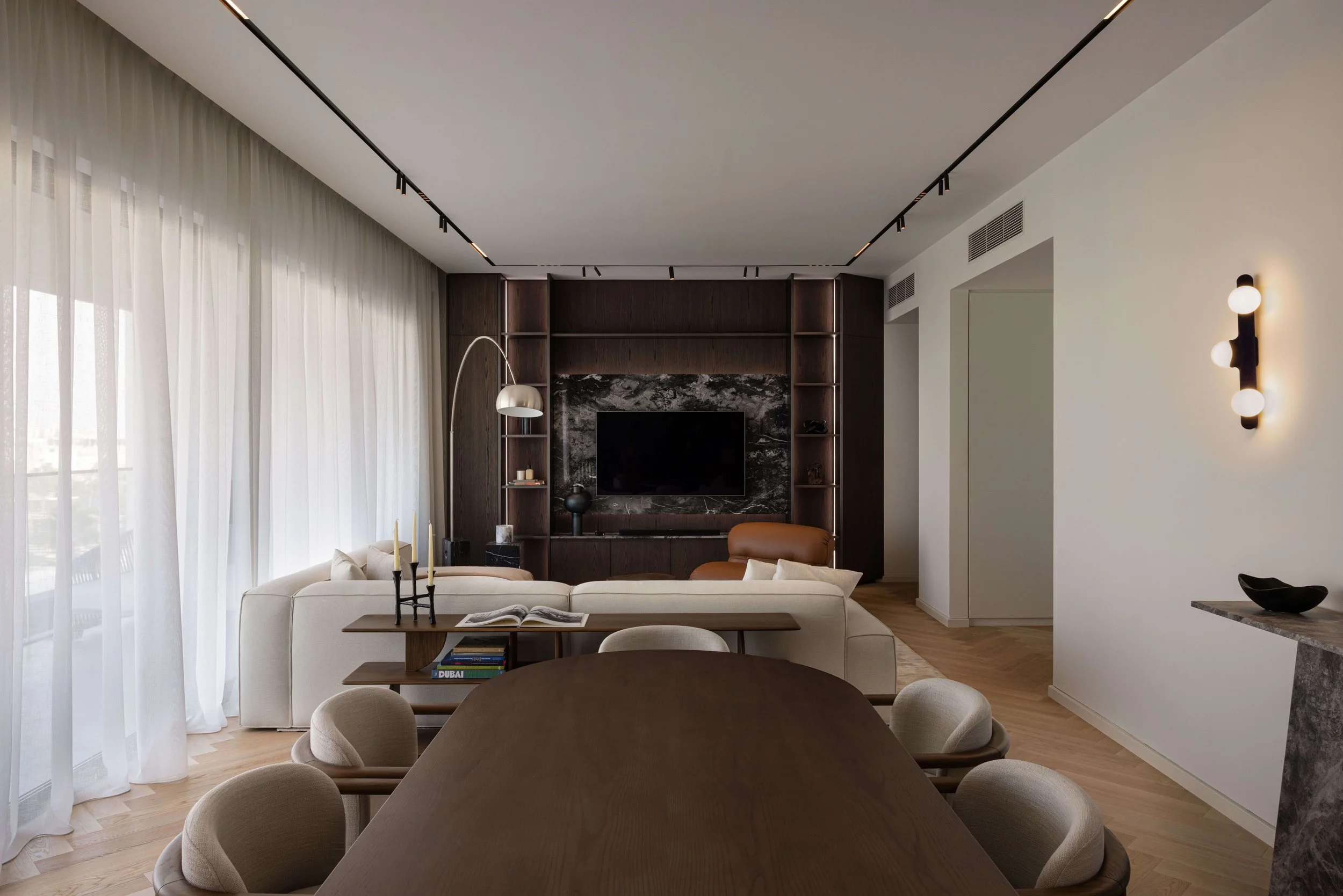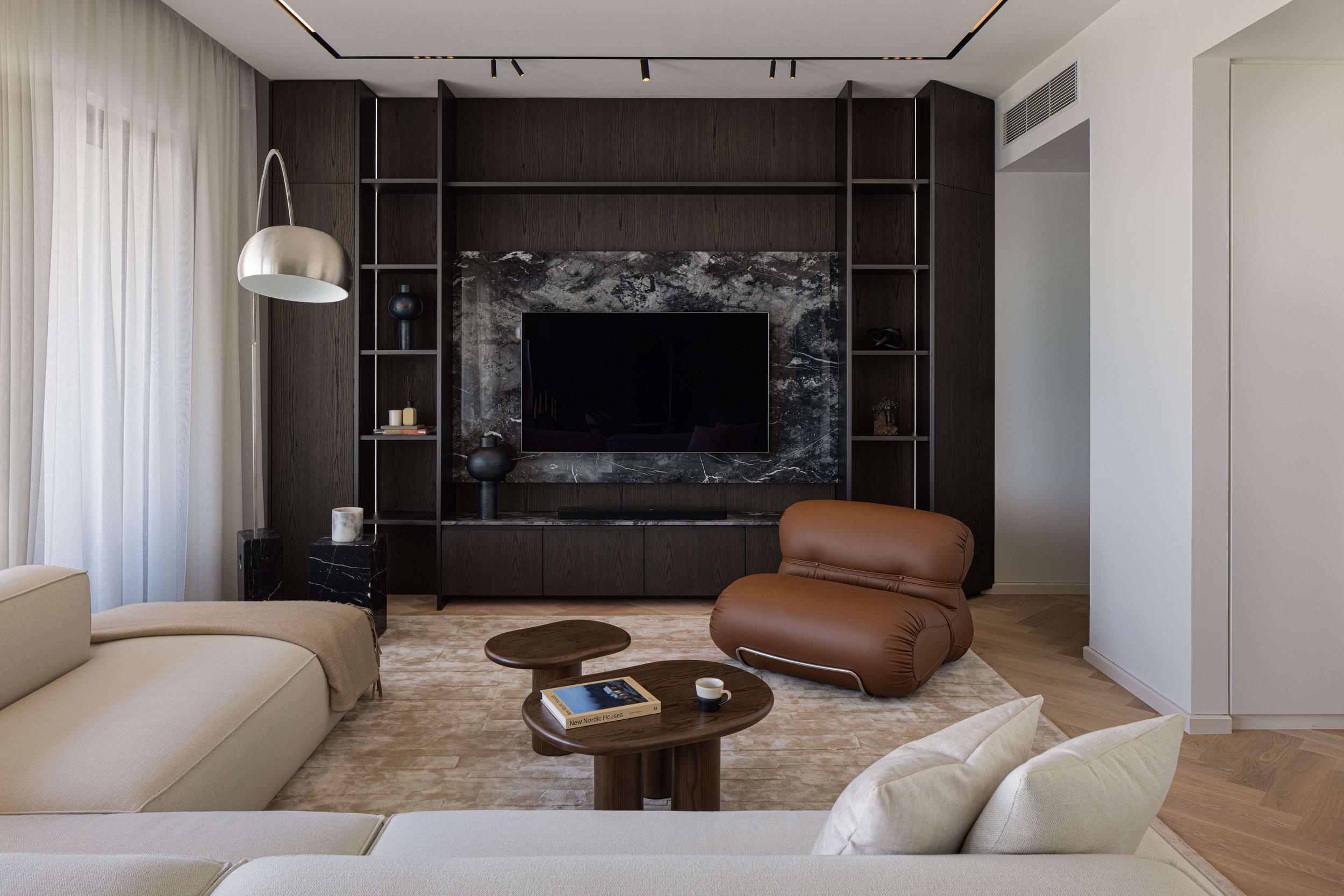 Opposite the living area, a bespoke joinery wall combines wood veneer, marble, and burnished metal shelving, introducing a subtle masculine edge without overwhelming the space. Furniture was selected to complement the architecture, with custom cream pieces, warm-toned wood, and an iconic 1970s leather armchair adding layers of texture and personality.