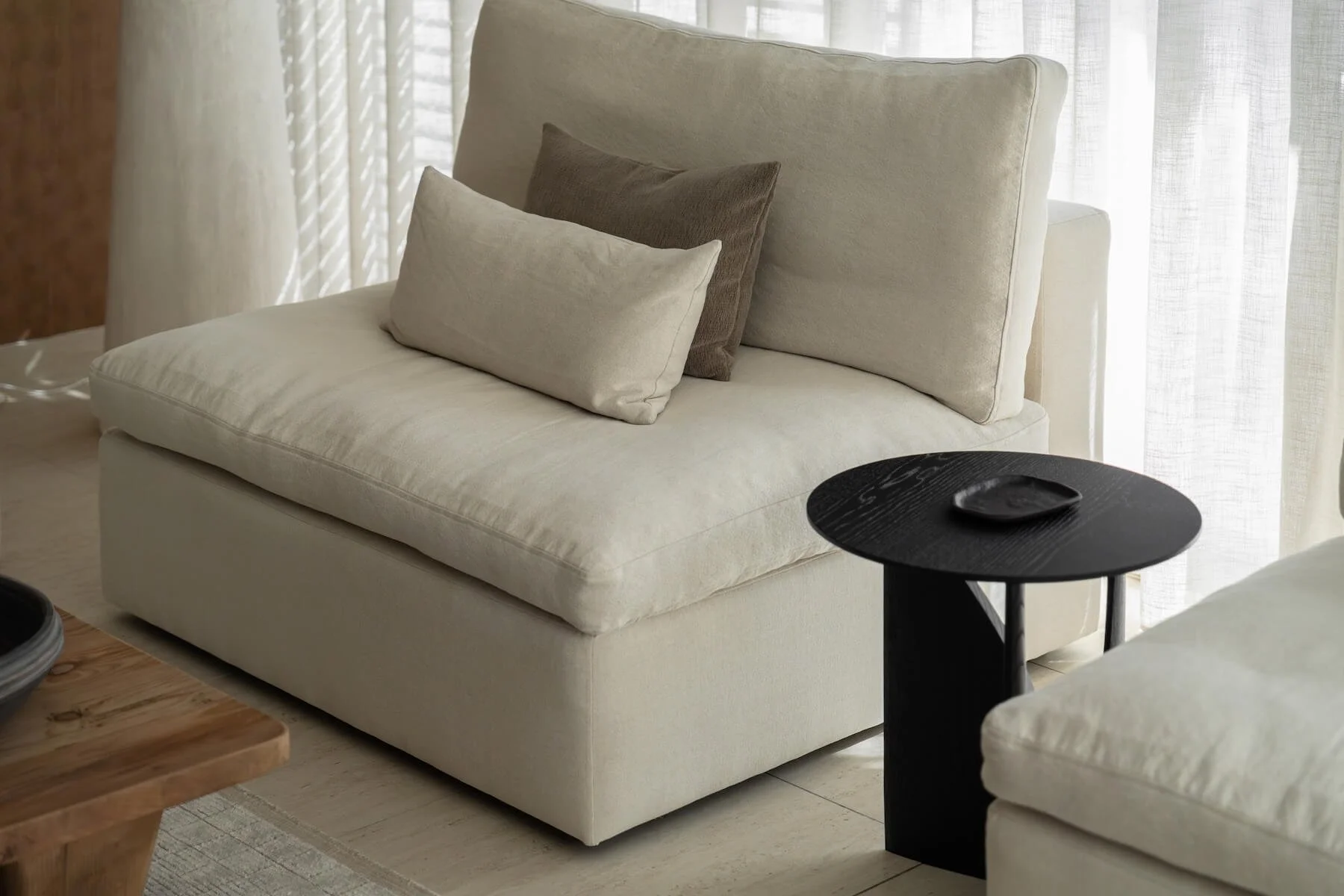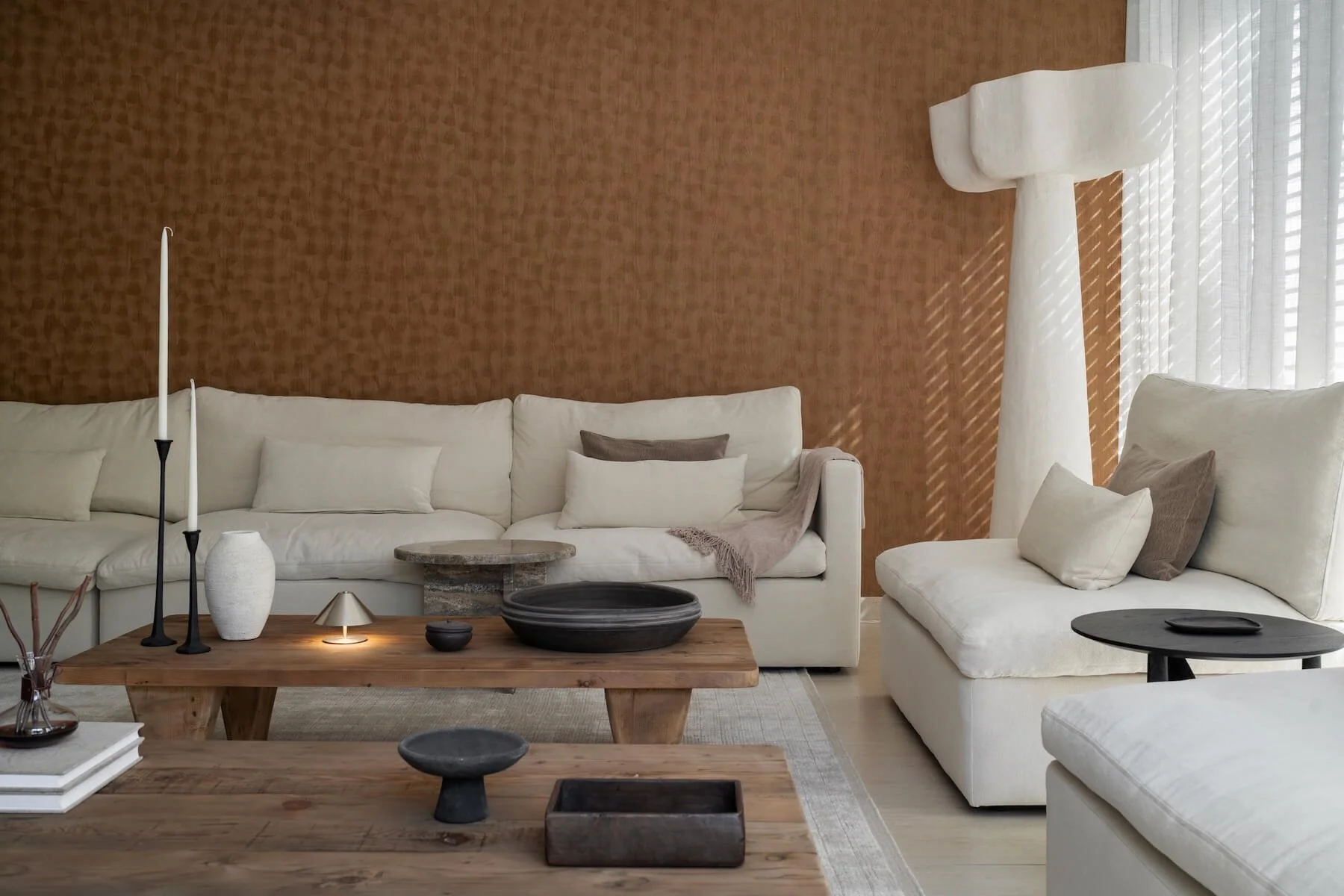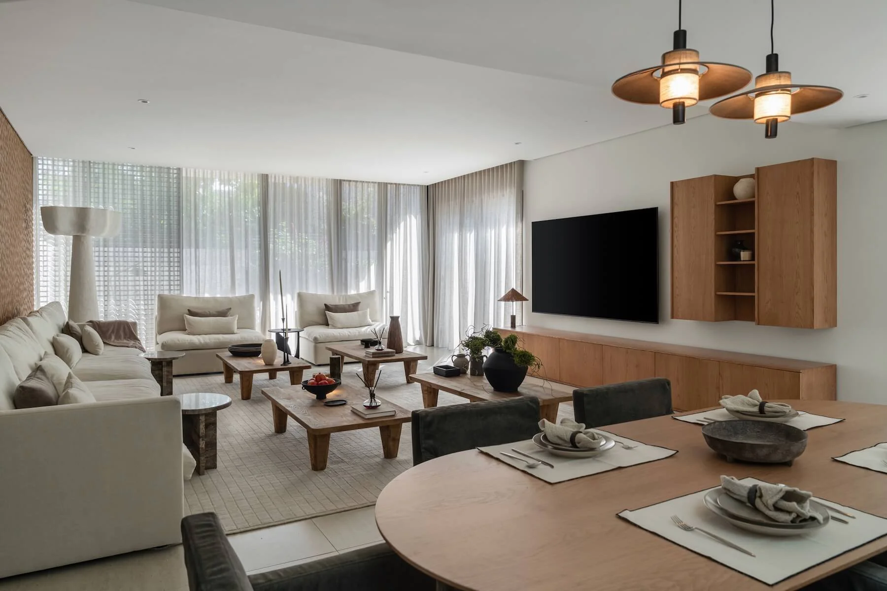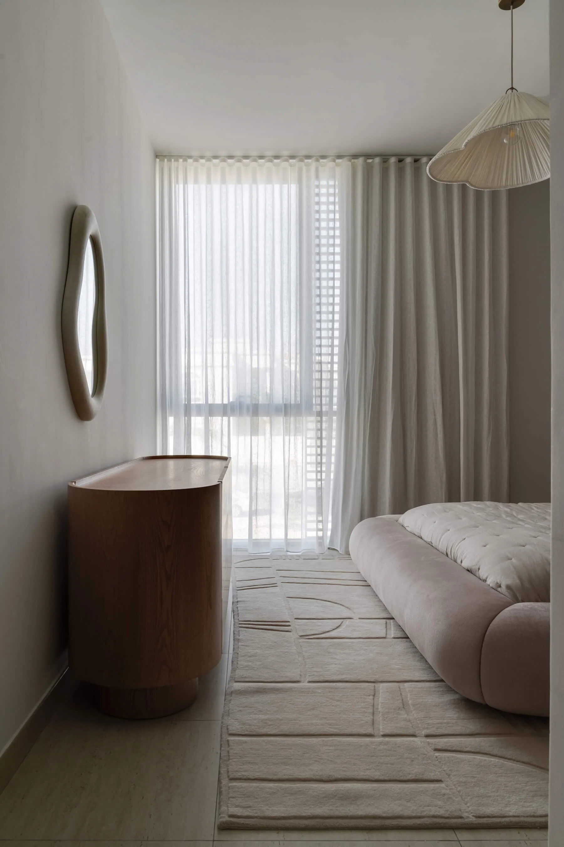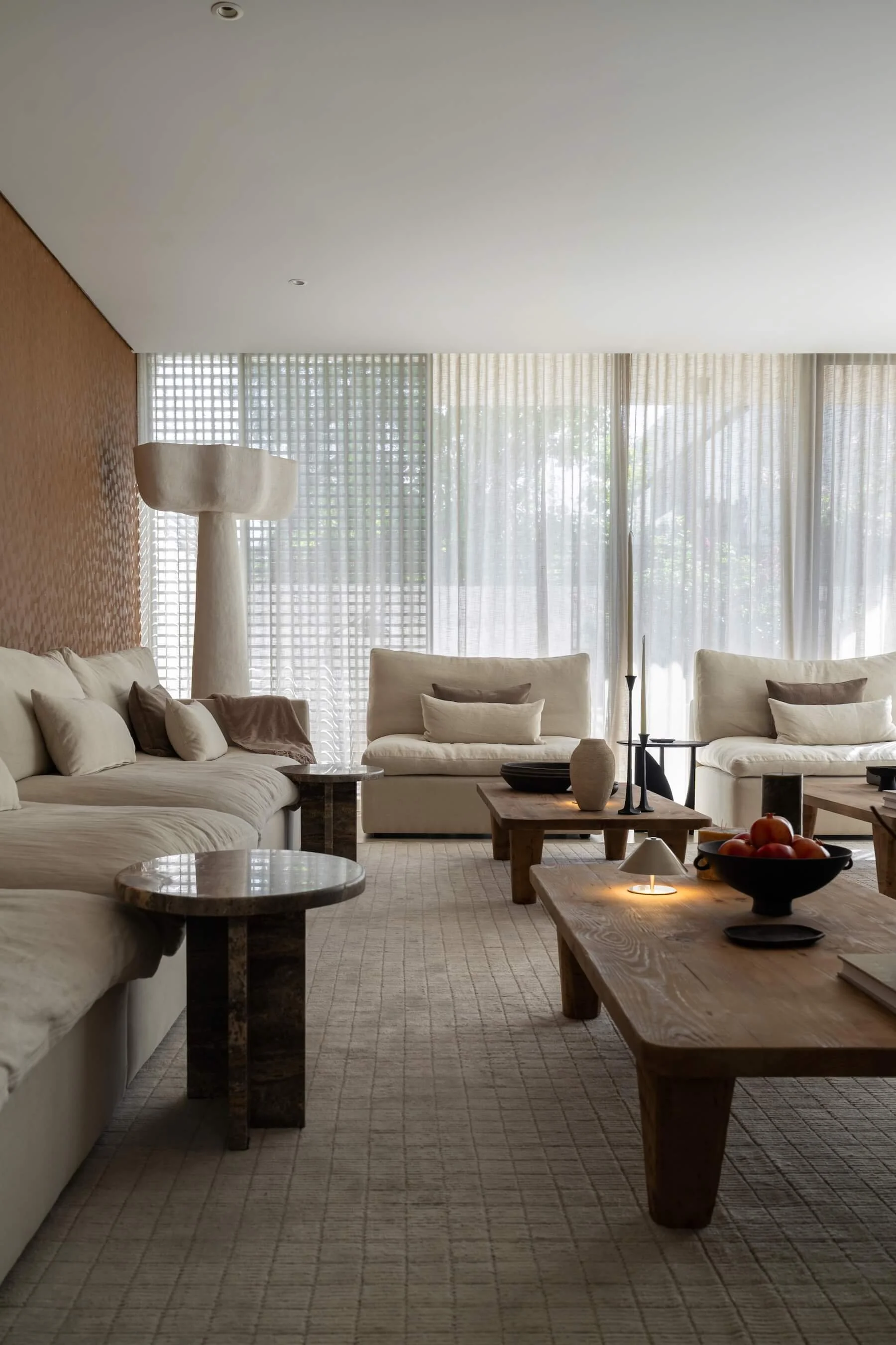 The result is a relaxed and elegant home where neutral tones, natural textures, and considered design come together to create a peaceful everyday environment.